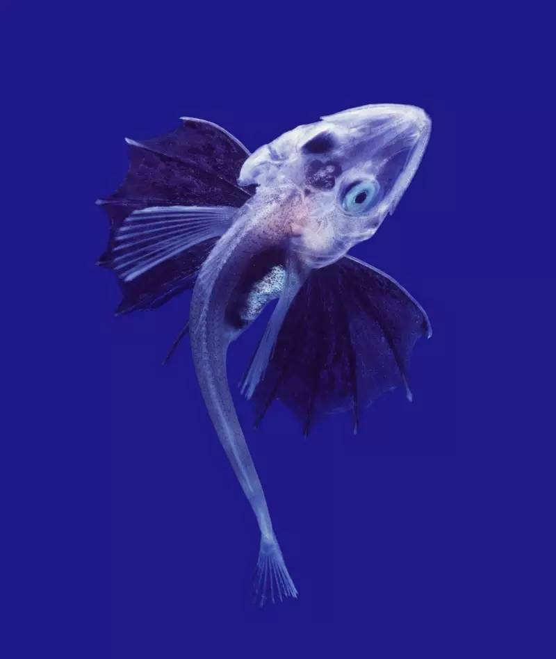 比目魚本身是一種隨處可見的普通魚類,不過像這樣散發(fā)熒光、通體透明的小家伙卻十分罕見。它們與箱鲀一樣大多都是成年比目魚剛誕下不久的幼兒,之所以將自己的身體打造得如此通透,多半是為了使自己過于醒目的“大餅”身材遠(yuǎn)離獵食者貪婪的視線。長到了一定的年歲,比目魚的周身就會(huì)逐漸出現(xiàn)飽滿的深色,這層具備偽裝性的體色能助它順利混跡在海底沙礫中,轉(zhuǎn)用另一種方式騙過獵食者的眼睛。