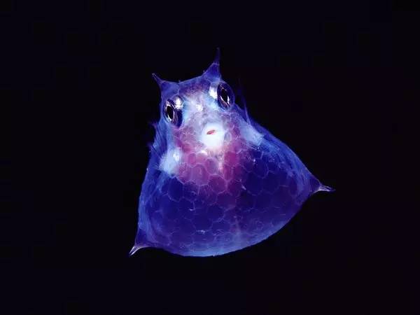 之所以命名為“箱鲀”嘛,自然是得益于這呆萌可愛的四方形軀干啦~如同河鲀一樣,棘背角箱鲀會(huì)在遇到危險(xiǎn)時(shí)將身體膨脹至極限,并且豎起全身棘刺以做防御——于是河鲀就把自己吹成了氣球,而箱鲀則變成了一個(gè)活靈活現(xiàn)的海中小魔方~棘背角箱鲀的成年種有著黃、藍(lán)、褐等多種艷麗體色,不過它的幼崽卻呈現(xiàn)出更為精致的全透明狀,非常美麗,就像下圖這樣~。