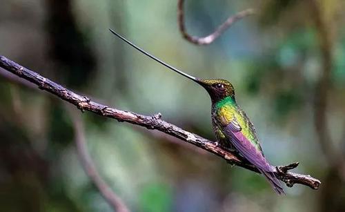 我叫劍嘴蜂鳥,我可是鳥中“仙子”因?yàn)槲抑缓嚷端」鋸埩耍∥议L著細(xì)細(xì)長長的嘴是因?yàn)槲蚁矚g喝花蜜,這樣的嘴巴可以幫助我吸取花蜜。