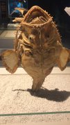 發(fā)光的“釣竿” 在黑暗的深海中生活著一種奇特的魚,它們面目猙獰,頭大而扁,口大如盆,皮膚粗糙,形似鬼怪,俗稱結(jié)巴魚、哈蟆魚、海哈蟆、琵琶魚等。學(xué)名鮟鱇,由于身體笨重,只能用像手臂一樣的胸鰭貼著海底緩慢爬行 作為一條只魚,情何以堪…… 雖然生活的“暗無天日”,但是它們從不為生計(jì)發(fā)愁,因?yàn)樗鼈儌€(gè)個(gè)是釣魚能手。 大胃王——鮟鱇的下顎和胃有很好的