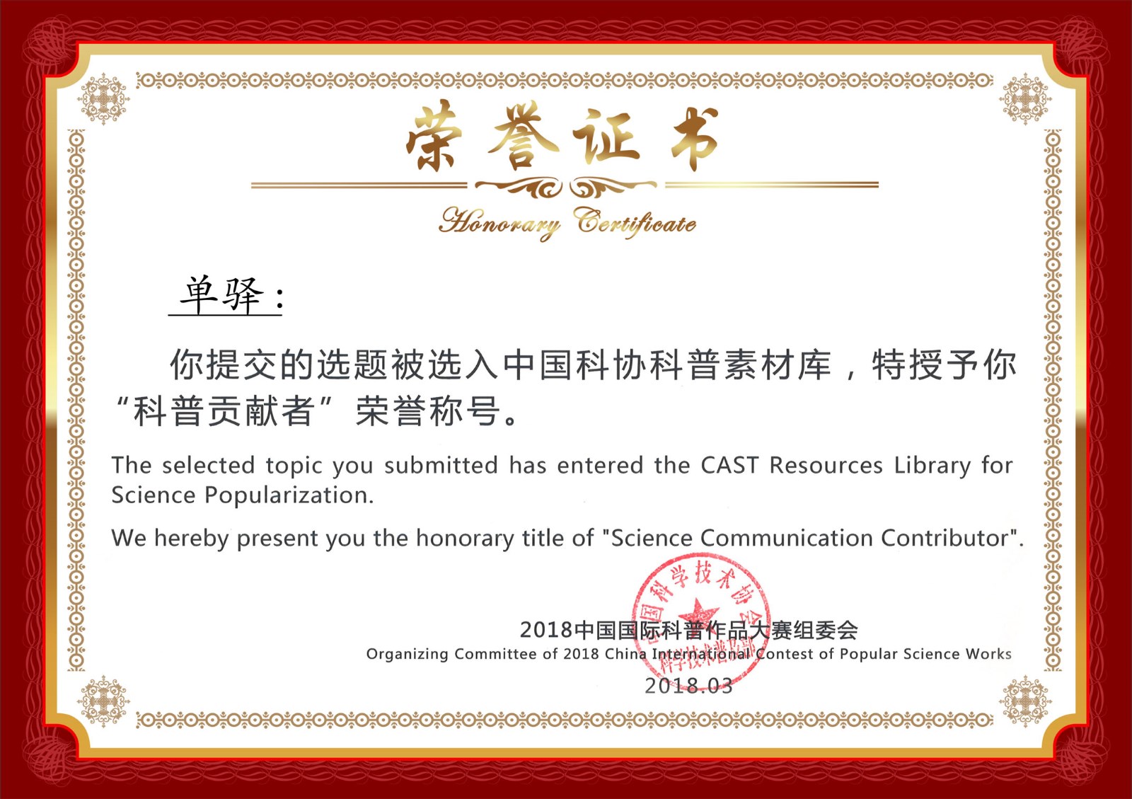 2018年3月15日,2018中國國際科普作品大賽組委會(huì)發(fā)布《關(guān)于2018中國國際科普作品大賽選題評選結(jié)果的公告》,生命奧秘博物館申報(bào)了8個(gè)選題,大賽組委會(huì)通過專家評審,其中4個(gè)選題從3803個(gè)選題中脫穎而出,被選入1339個(gè)基礎(chǔ)選題之中,被納入中國科協(xié)科普素材庫。入選基礎(chǔ)選題的作者由2018中國國際科普作品大賽組委會(huì)頒發(fā)“科普貢獻(xiàn)者”榮譽(yù)證書。