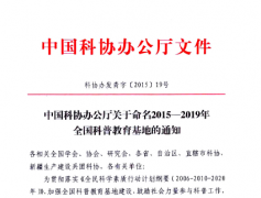 中國科協(xié)辦公廳關(guān)于命名2015—2019年全國科普教育基地的通知2015年06月25日 科協(xié)辦發(fā)青字〔2015〕19號 各相關(guān)全國學(xué)會、協(xié)會、研究會,各省、自治區(qū)、直轄市科協(xié),新疆生產(chǎn)建設(shè)兵團(tuán)科協(xié),各有